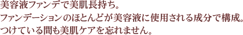 | 肌本来が持つ質感を、よりいっそう引き出してくれます。 心地よい使用感で「なりたい肌」へ美しくコントロール。 まるで素肌のような自然な肌色を作り上げる。水溶性だから皮膚呼吸を妨げず、肌にむらなく伸び、とてもフィット感のあるファンデーションです。 肌のテカリを沈め、ファンデーションをしっかりと肌に馴染ませます。セミマットのしっとりとした色合いで、ナチュラルで美しい仕上がりを手助けします。 |